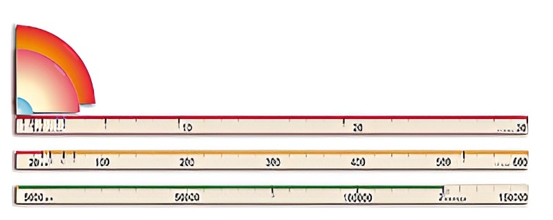 Изображения на карточках цветные, отпечатаны на магнитном виниле. Все шкалы имеют длину 1,5 м и деления через каждые 5 см. Каждая шкала имеет свой масштаб расстояний (в одном делении 1, 20 и 5000 а.е. соответственно).