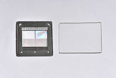 Две дифракционные решетки (300 и 600 штрихов на миллиметр) выполнены на одном слайде и вставлены в рамку, третья – стеклянная пластина с одной дифракционной решеткой 100 штрихов на миллиметр.