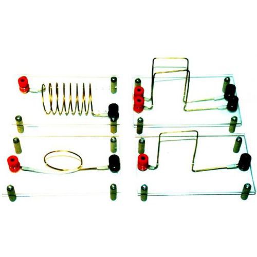 В состав набора входят прозрачные панели из органического стекла, сквозь которые пропущены проводники различной формы, выведенные на клеммы для подключения к источнику постоянного тока. Картины силовых линий магнитных полей образуются при посыпании панелей с проводниками, по которым протекает постоянный ток, мелкими железными опилками. Для демонстрации магнитных полей учащимся панели устанавливаются на кадровое окно графического проектора.