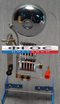 Звонок смонтирован на пластмассовой панели. Монтаж выполнен таким образом, что хорошо видны все детали. Для регулировки амплитуды колебания ударника предусмотрен винт с контргайкой. Панель со звонком закреплена на подставке. Напряжение постоянного тока для питания – 4-6 вольт. Для демонстрации необходимы: источник постоянного тока, выключатель однополюсный, комплект соединительных проводов. Перед демонстрацией, с помощью соединительных проводов присоединить звонок через выключатель к источнику питания. Отрегулировать необходимую амплитуду колебания ударника звонка и затем уже включить питание. Так как катушки электромагнитов низкоомные и дабы не перегружать источник питания, демонстрацию проводить кратковременно.