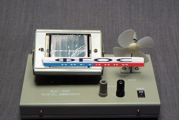 Прибор представляет собой подставку, с расположенными на ней солнечной батареей и крыльчаткой. На подставке солнечной батареи установлены два винтовых зажима, к которым с помощью клемм подсоединяются электродвигатель и генератор с излучателем.