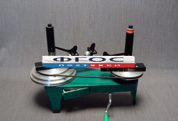Машина состоит из следующих частей: основания на ножках с выдвижным ящичком для металлических шаров (металлические шары поставляются в комплекте в количестве 3 шт.), съемной ручки вращающей два диска переменной скорости вращения, соединенных между собой резиновым приводным ремнем. На дисках закреплено по градуированному плечу с рельсами для укладки металлических шаров и рычагов, передающих центробежную силу на цилиндрические подпружиненные кожухи вертикальных шкал. В комплект входят три металлических шара, два из которых одинакового веса, а третий более легкий.