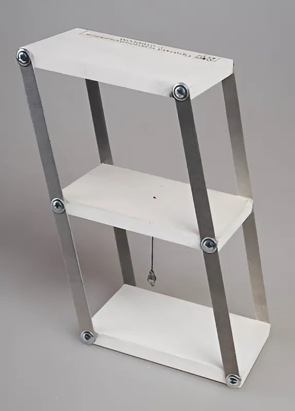 Призма состоит из 3-х прямоугольных пластин, подвижно соединенных по углам рейками. Представляет собой модель однородного тела с меняющейся формой. В центре тяжести имеется отвес.