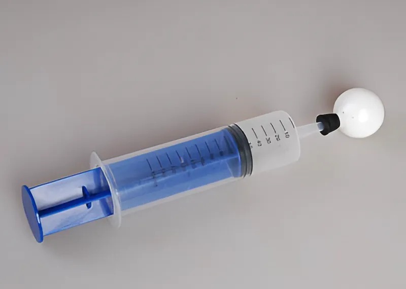 Прибор представляет собой пластмассовый сосуд с поршнем и полый шар, по всей сферической поверхности которого имеются отверстия одинакового диаметра (1 мм). Шар плотно насаживается на патрубок сосуда с поршнем.