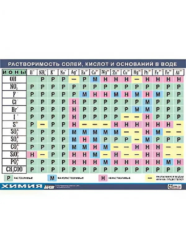 Таблица демонстрационная "Растворимость солей, кислот и оснований в воде" (винил 100х140)