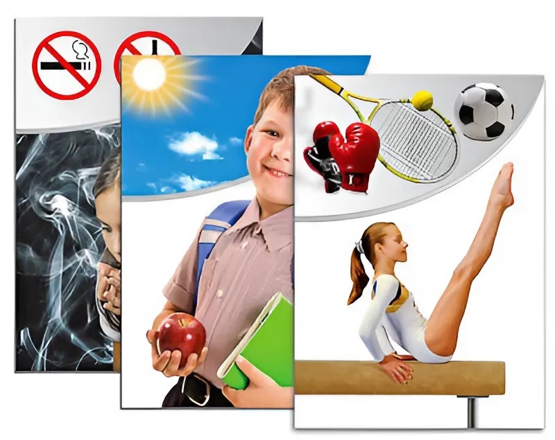 Пособие включает карточки с изображениями здоровых и нездоровых детей, а также картинки, иллюстрирующие факторы, положительно и отрицательно влияющие на здоровье человека. Карточки напечатаны на картоне, ламинированы матовой (антибликовой) пленкой и снабжены магнитами, что позволяет легко крепить их на магнитной доске или экране для динамических пособий.