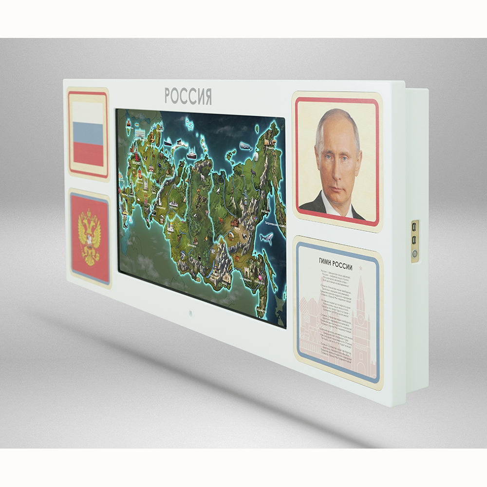 Настенная интерактивная панель с сенсорным монитором, декорированная основной символикой РФ: герб, флаг, гимн, портрет президента. Разработана для реализации программы патриотического воспитания в школе, детском саду или других образовательных учреждениях. Подходит для оформления входной зоны и классов.