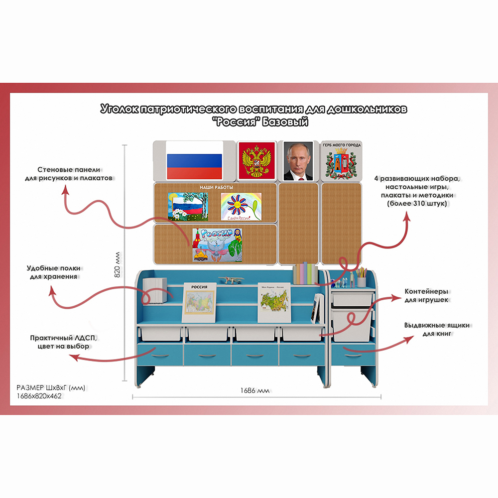 Уголок патриотического воспитания для дошкольников "Россия" Базовый предназначен для проведения занятий по патриотическому воспитанию среди дошкольников в детских садах. Оборудование помогает знакомить детей с традициями и обычаями своей страны, историческими фактами. Применение книг и игр делают обучение более продуктивным, по сравнению с традиционными методами.