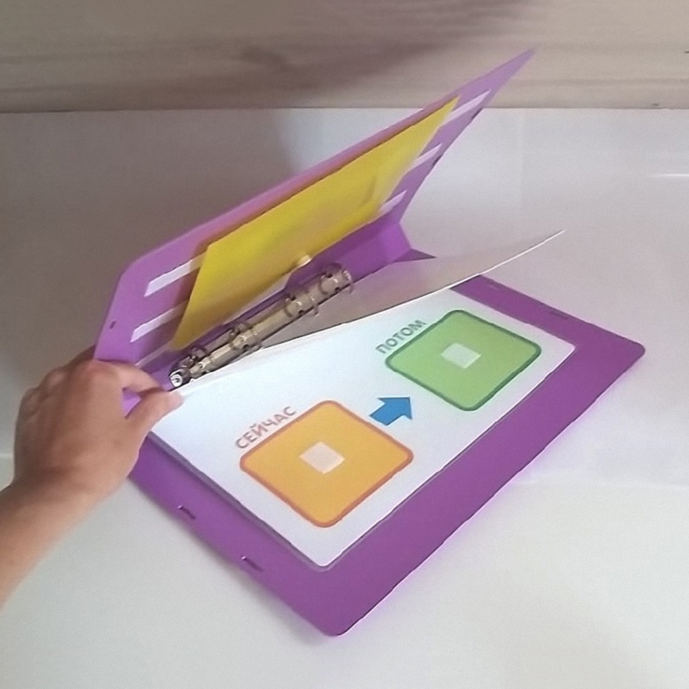 Увеличенный размер папки и крупные ячейки "сейчас - потом" позволяют использовать карточки размером до 10*10 см.