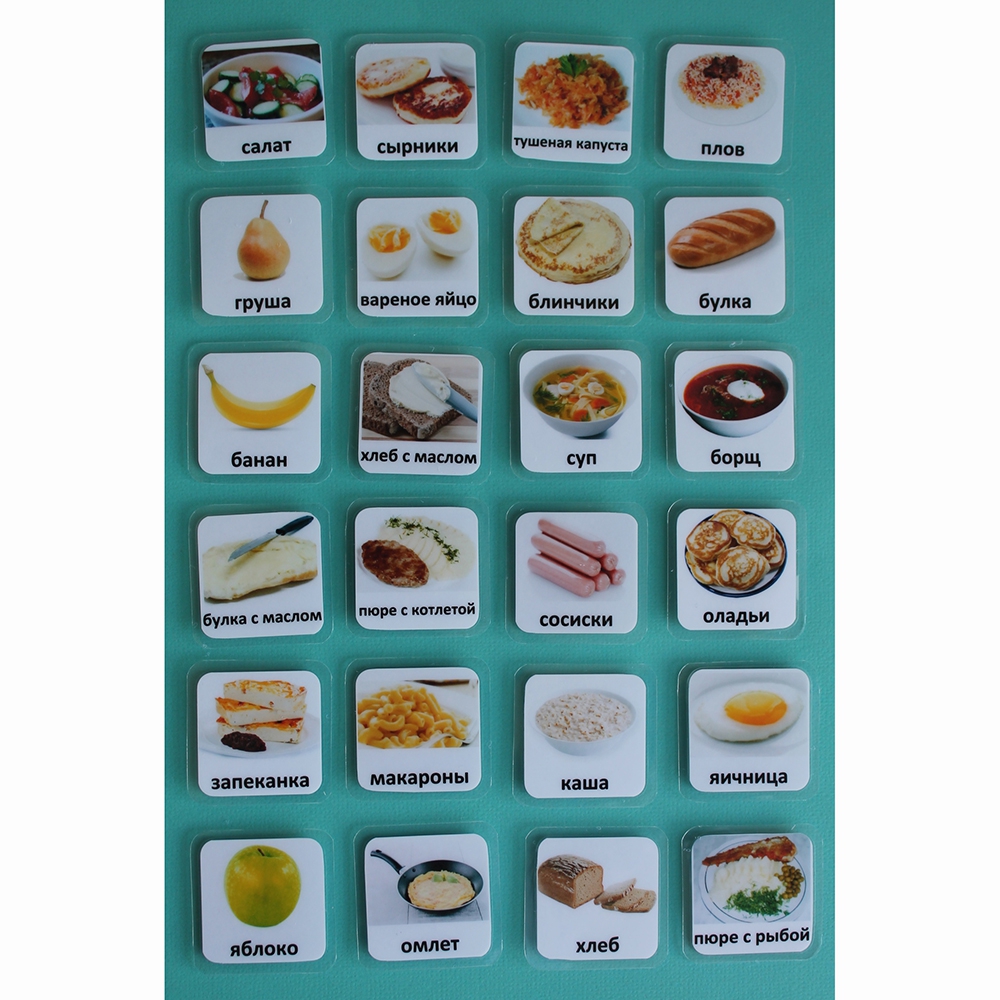 Карточки PECS – система альтернативной коммуникации для детей, у которых трудности с речью и общением. Карточки "Еда-1" помогут вашему ребенку в повседневной жизни, уменьшат неприемлемое поведение, структурируют день. Они пригодны для использования в коммуникативных книгах и визуальных расписаниях.