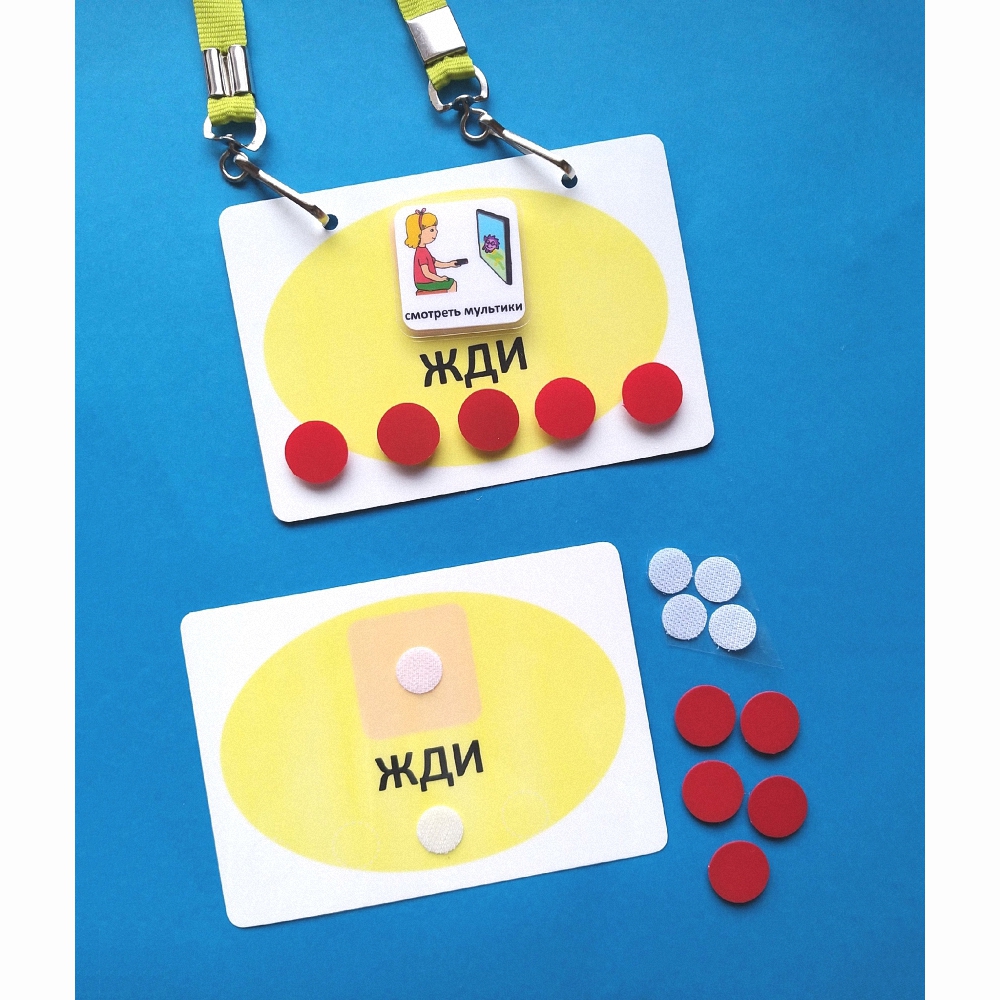 Планшет изначально имеет только 1 кружок - липучку для одного жетона. Ещё 4 липучки входят в комплект, но будут приклеиваться на планшет постепенно, когда ребёнок научится ждать дольше.