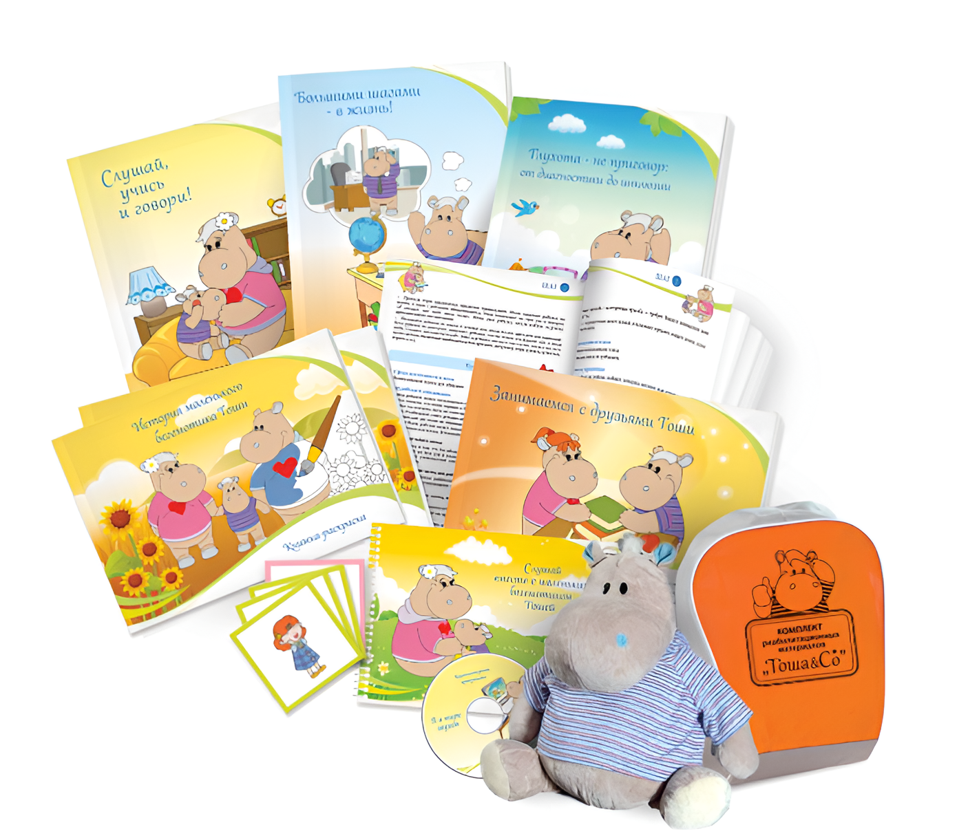 Главный герой сюжетной линии всех пособий «Комплекта реабилитационных материалов «Тоша&Co» – мягкая игрушка «Бегемотик Тоша» – верный друг и помощник ребенка на занятиях с педагогами и родителями.