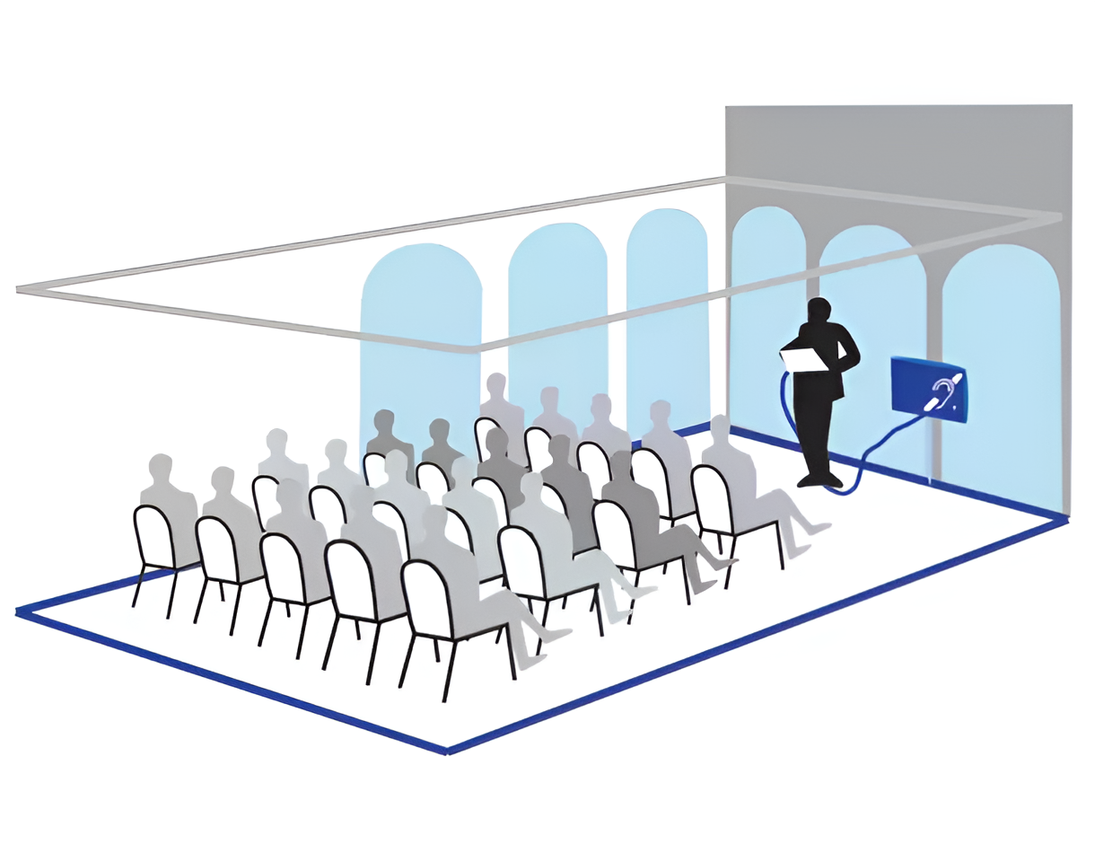 Стационарная индукционная петля монтируется в пол, потолок или стены по периметру помещения и соединяется с усилителем, расположенным в непосредственной близости от петли. Питание усилителя осуществляется от сети переменного тока. Звуковая информация поступает на микрофон и передается в слуховой аппарат посредством электромагнитной индукции (режим «Т») равномерно во всей зоне охвата петли. Стационарная индукционная петля может быть подключена к системам оповещения, громкой связи и другим источникам сигнала.
