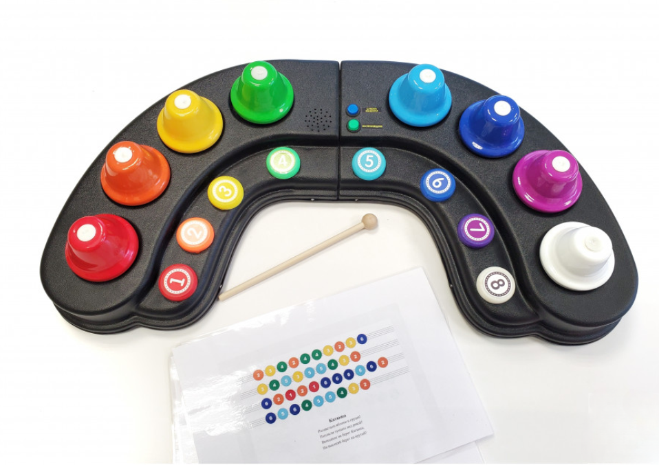 Игра «Мини-колокольчики» предназначена для детского общего развития и развития детей, имеющих проблемы со слуховым восприятием и коммуникацией. Представляет собой изогнутый полумесяцем корпус, на котором размещены 7 колокольчиков и 7 пронумерованных кнопок (кнопка, соответствующая колокольчику, окрашена с ним в один цвет). Также в набор входит комплект карточек (6 шт.), на каждой из которых «прописана» мелодия разноцветными кружочками вместо нот. Цвет кружочка соответствует цвету кнопки, на которую необходимо нажать. Представленная игра помогает познакомить ребенка с нотной грамотой и развить слух, учит выдерживать ритм мелодии и развивает мелкую моторику. Изготовлено из высококачественного ударопрочного пластика, имеет обтекаемые плавные формы без острых краёв и углов.