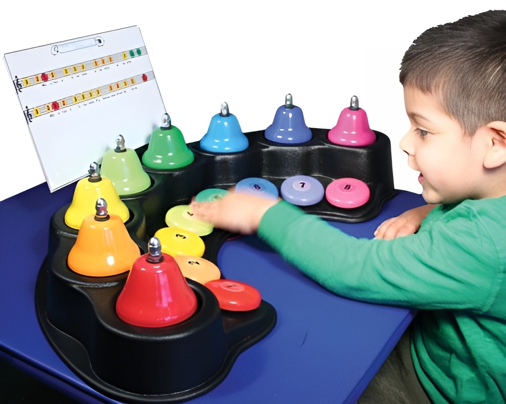 В комплекте с колокольчиками идут 6 карточек, на которых цветными кружочками записаны ноты детских песенок. Цвет кружочка-ноты соответствует кнопке того же цвета на игрушке. Нажимая кнопки в последовательности, указанной в карточке, можно воспроизвести одну из шести детских песенок.