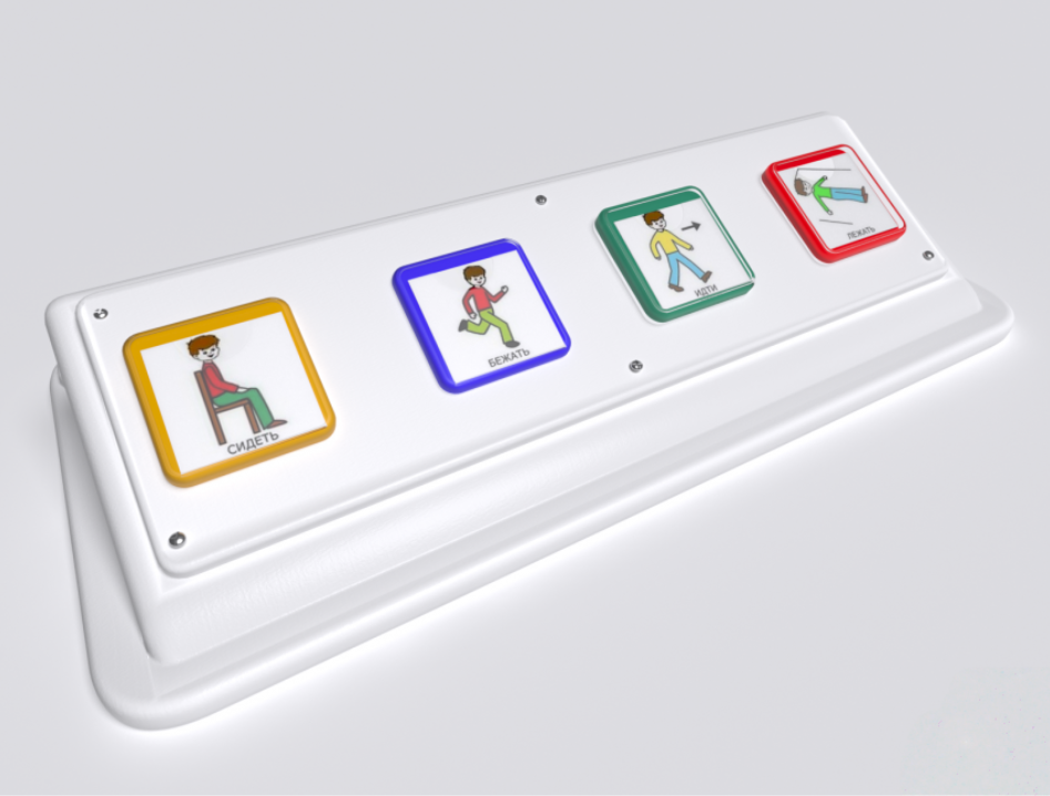 4-х кнопочный игровой коммуникатор предназначен для развития детей, имеющих проблемы со слуховым, зрительным восприятием и коммуникацией. Представляет собой прямоугольный корпус, задняя часть которого слегка возвышена над передней под плавным углом, на котором размещены 4 кнопки с окошками для картинок с надписями. Изготовлено из высококачественного ударопрочного пластика, имеет обтекаемые плавные формы без острых краёв и углов. Есть возможность подключения до 4-х выносных кнопок.