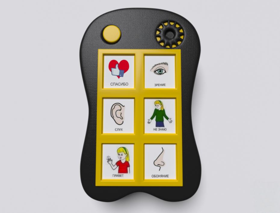 Гоу! игровой коммуникатор 6+ предназначен для развития детей, имеющих проблемы со слуховым, тактильным, зрительным восприятием и коммуникацией (аутизм, ДЦП). Представляет собой компактный корпус, предназначенный для ношения с собой (предусмотрены отверстия для ремешков); на корпусе размещены 6 кнопок с окошками для подписанных демонстрационных карточек. Имеется возможность записи сообщений на общее время 42 минуты. Изготовлено из высококачественного ударопрочного пластика, имеет обтекаемые плавные формы без острых краёв и углов.