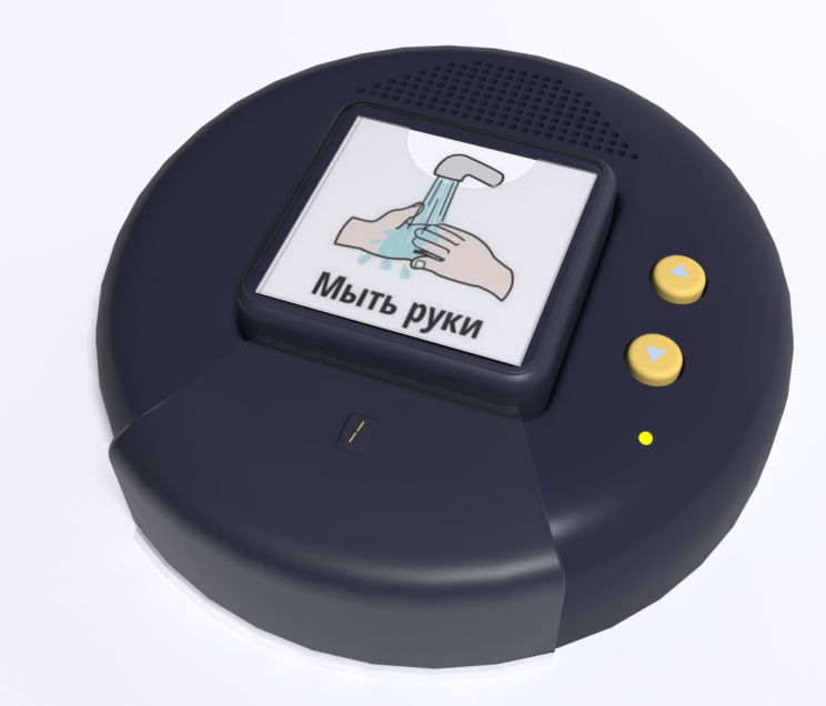 Кнопка-игровой коммуникатор №2 предназначена для социализации детей, которые имеют проблемы со слуховым, визуальным, тактильным восприятием и коммуникацией. На круглом компактного размера корпусе имеются 2 кнопки для переключения между уровнями и громкостью. Длительность одного сообщения – 60 секунд, общее количество записываемых голосовых сообщений – 10.  В центре корпуса расположен ЖК-дисплей с кармашком для демонстрационных карточек. Устройство изготовлено из высококачественного ударопрочного пластика, имеет обтекаемые плавные формы без острых краёв и углов. Коммуникатор адаптирован для российских пользователей: устройство имеет встроенную аккумуляторную батарею с зарядным устройство в комплекте и преподавателю не придется покупать еженедельно новые батарейки.