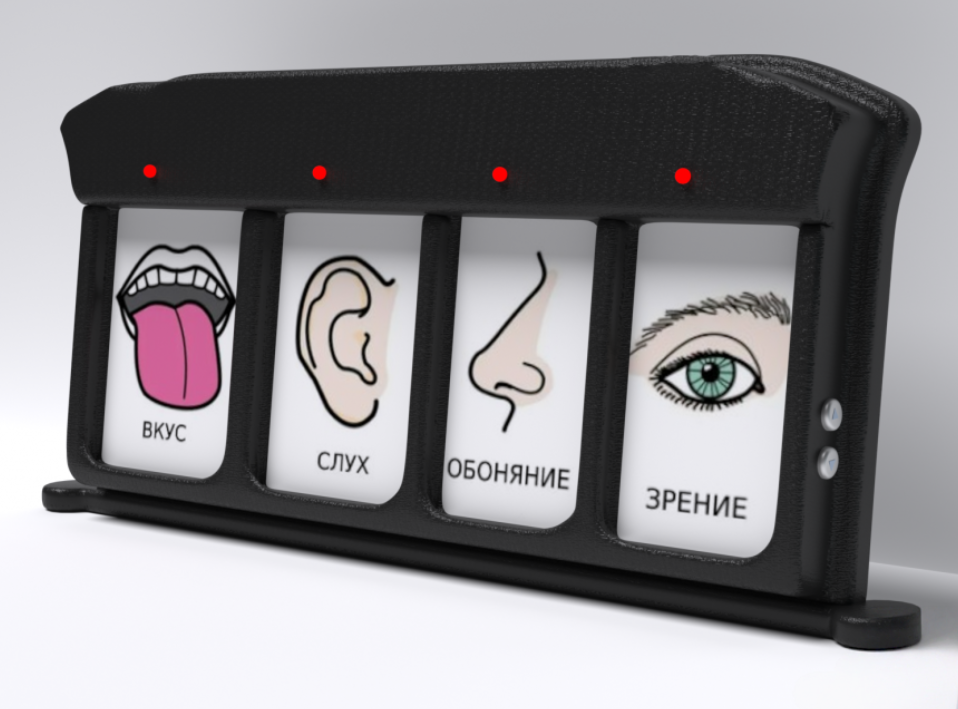 4-вариантный сканер-игровой коммуникатор предназначен для развития и реабилитации детей, имеющих проблемы со слуховым, тактильным, зрительным восприятием и коммуникацией (ДЦП, аутизм, СДВГ и т.д.). Это устройство обеспечивает 4 режима сканирования — инверсный, автоматический, два переключателя и пошаговый. Представляет собой прямоугольный корпус, на котором размещены 4 кнопки с изображением и подписью определенного органа чувств – «Вкус», «Слух», «Обоняние», «Зрение». Изготовлено из высококачественного ударопрочного пластика, имеет обтекаемые плавные формы без острых краёв и углов.