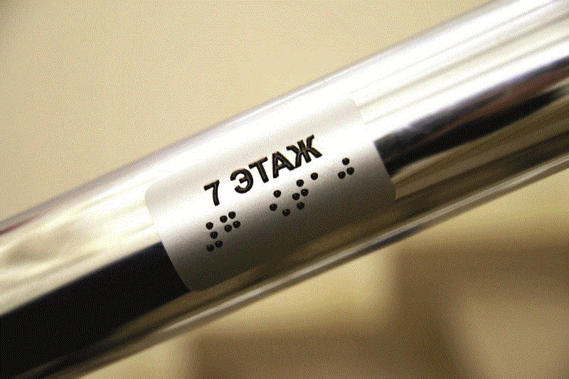 Наклейка на поручень (Брайль) используется в качестве тактильного указателя, которая позволяет человеку с ограничением зрения понять, на каком этаже в данный момент он находится.