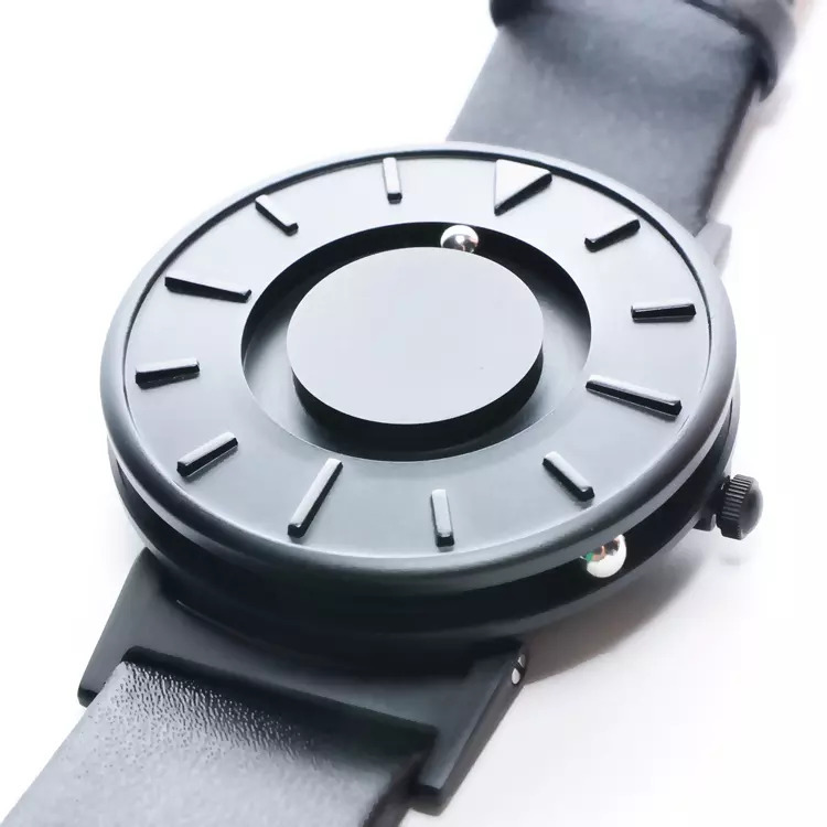 Уникальные стильные тактильные кварцевые часы вместо стрелок используют магнитные шарики, которые двигаются по круговым бороздкам. Первая находится на циферблате в специальной канве и указывает на минуты, вторая расположена сбоку на оси корпуса и отвечает за текущий час.