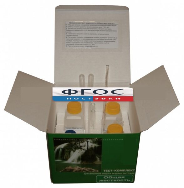 Тест-комплект «Общая жёсткость» представляет собой удобный для переноски, транспортирования и хранения корпус-укладку, в который компактно размещены необходимые средства измерения, готовые растворы и реагенты, посуда и оборудование, документация.