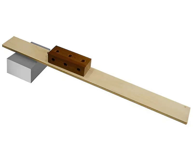 Прибор состоит из линейки и деревянного бруска с петлей на его торце и тремя гнездами для грузов. С помощью этого прибора можно измерить коэффициент трения покоя, коэффициент трения скольжения дерева по дереву, КПД наклонной плоскости, вычислить механическую работу, выяснить зависимость коэффициента трения от массы груза и площади поверхности.