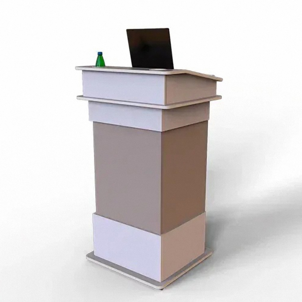 Необычным дизайном характеризуется трибуна АВТ-005 для различных выступлений. Изготавливается из экологически чистых и безопасных для человека материалов. Декоративный корпус выполняется из ламинированной ДСП, а кромка – ПВХ. Цвет можно подобрать разный. При необходимости установить логотип организации или герб Российской Федерации.