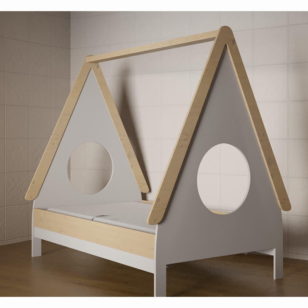 Детская кровать предназначена для детей от 3 до 12 лет. Выполнена в светлой цветовой гамме, что позволяет использовать ее в помещении с любым интерьером. По форме напоминает вигвам. Дизайн наиболее простой и лаконичный – благодаря этому можно украсить место для сна ребенка дополнительными аксессуарами – например, повесить балдахин или добавить ночник-гирлянду. Конструкция кровати надежна и прочна – это гарантирует безопасную эксплуатацию.