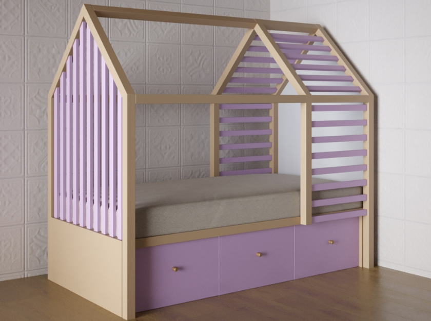 Конструкция кровати представляет из себя домик в скандинавском стиле с крышей и стенами, часть которых отделаны рейкой нежно-лилового цвета, визуально разграничивая пространство. Внизу есть 3 ящика для игрушек.