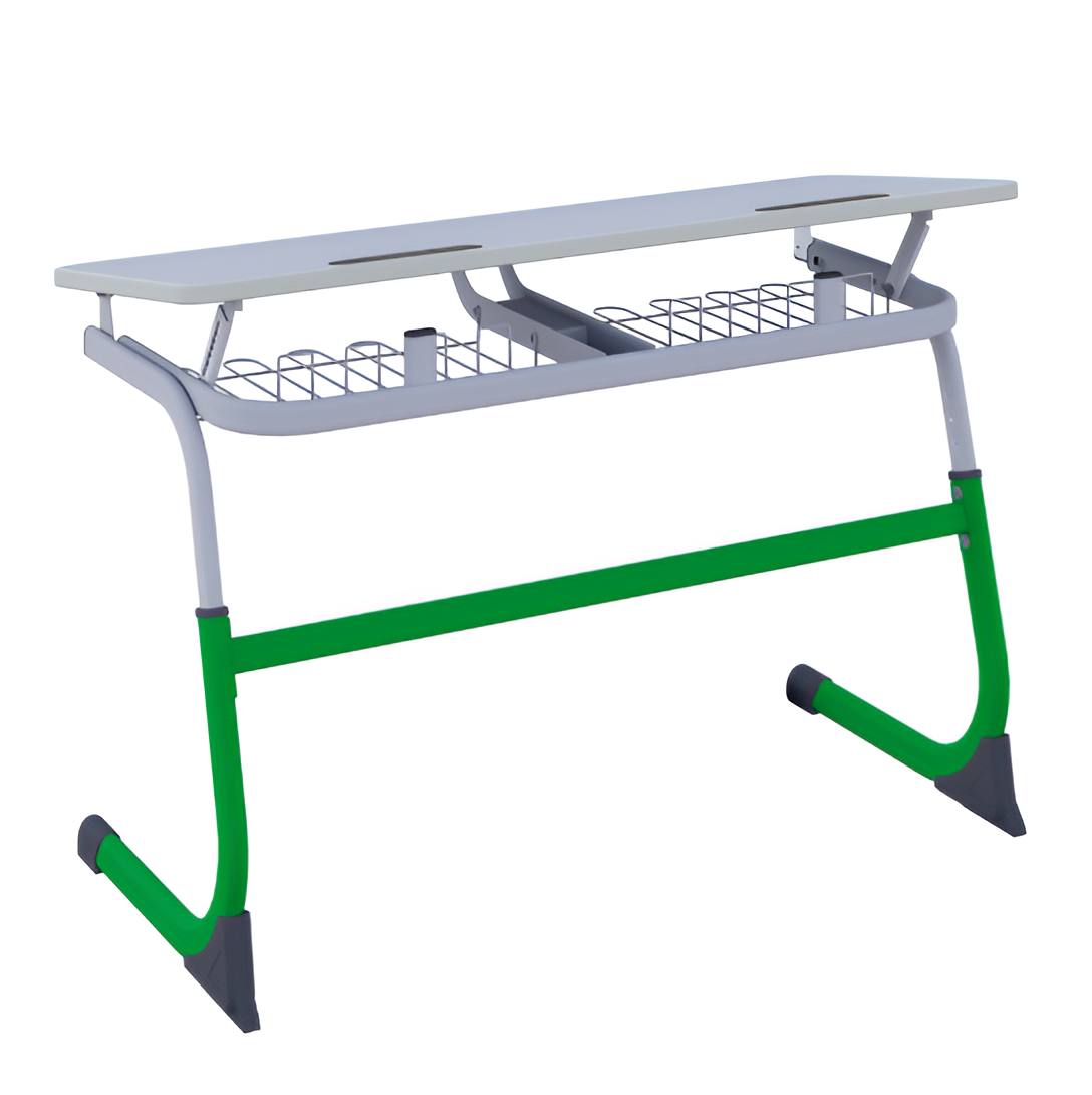 Парта SMARTY двухместная регулируемая по высоте с углом наклона столешницы, металлическим основанием и кромкой ПВХ, имеет встроенные пластиковые пеналы и крючки.