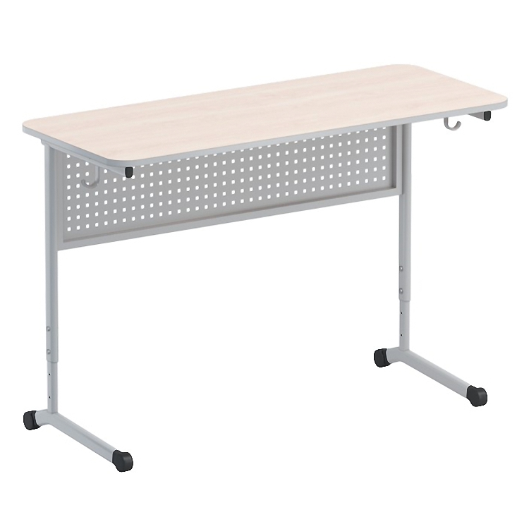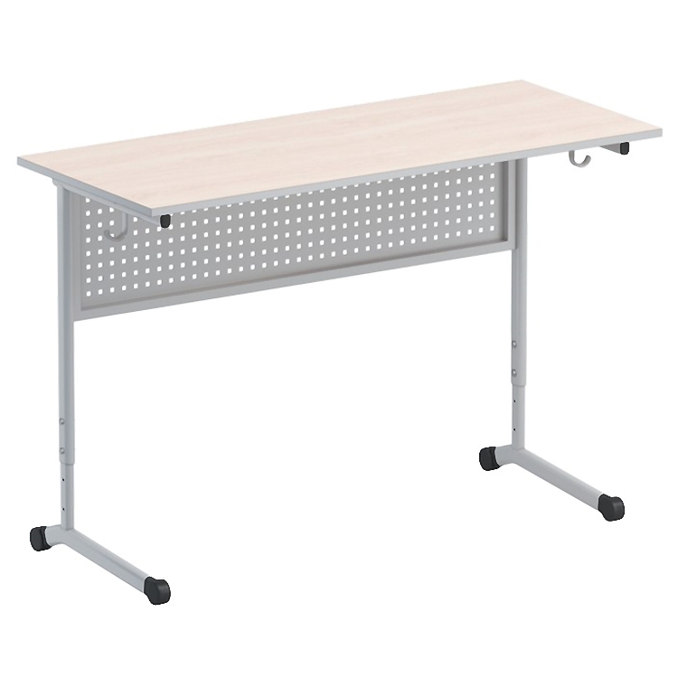 Стол ученический, 2- местный, регулируемый по высоте (гр.р. 5-7) с перфорированной панелью на плоскоовальной трубе. Стол изготовлен на металлическом каркасе с прямоугольной столешницей из ламинированной ДСП 16мм. Столешница облицована кромкой ПВХ толщиной 2мм.