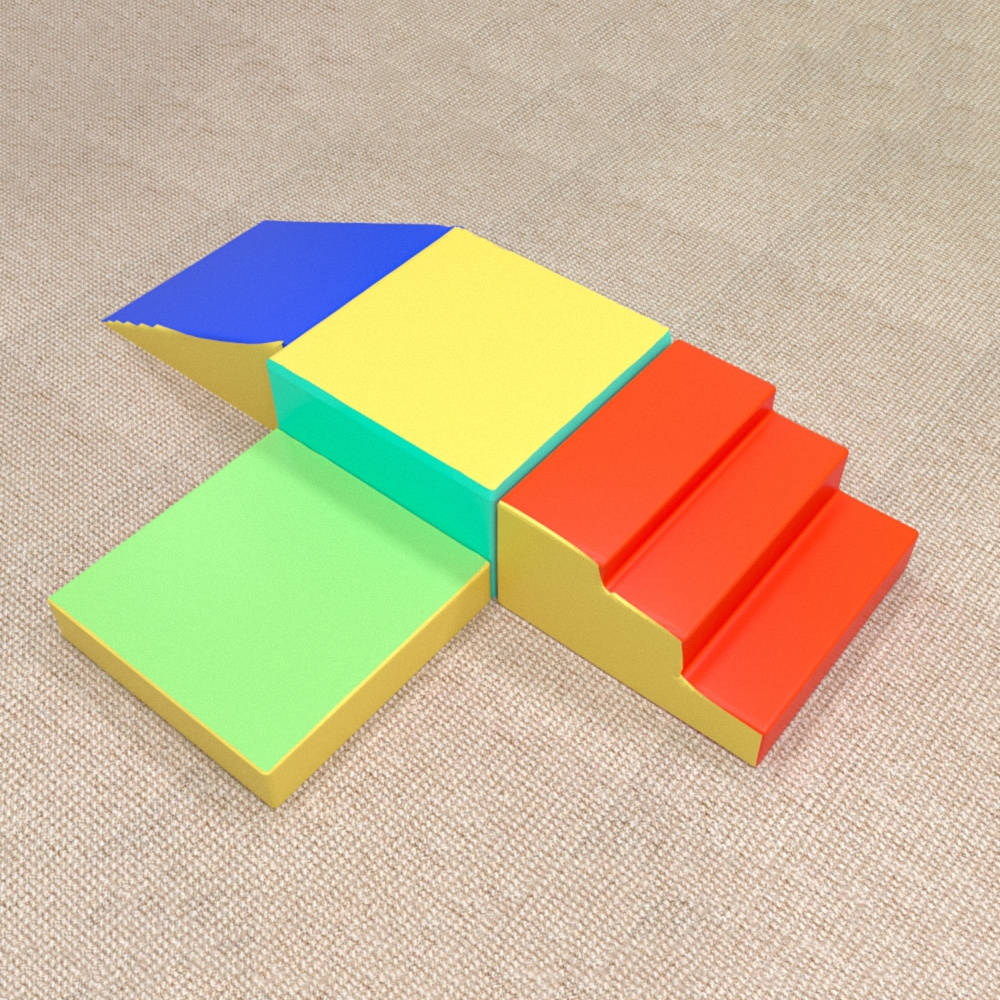 Спортивный мягкий модульный комплекс детский представляет из себя своеобразный подиум с возвышением посередине, на который дети взбираются с двух сторон при помощи лестницы, а ещё с одной – спускаются, как с горки. Состоит из 4 элементов разнообразных форм и цветов, вместе образующих единый комплекс. Плюсом является бескаркасная конструкция модуля (это помогает избежать травмирования ребёнка), как и мягкий, упругий наполнитель, который также устойчив к разрывам и повреждениям благодаря особой микропористой структуре. Покрытие легко моется.