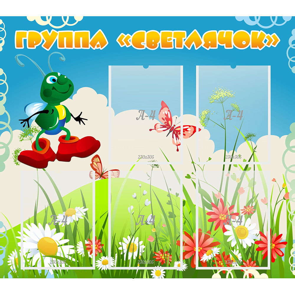 Для дизайна стенда выбрана природная тематика. На лугу растут красивые цветы, голубое небо разбавлено белыми облаками. Главным элементов дизайна является смешной светлячок в забавных ботинках красного цвета. Вокруг порхают бабочки. Название стенда оформлено в одну строку буквами желтого цвета. В изготовлении стенда используется качественная фурнитура, стойкие краски, высококачественный материал.