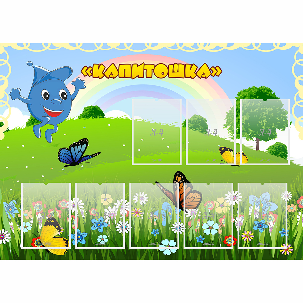 Элементы дизайна для данного стенда: зеленый луг, красивые цветы и деревья, яркая радуга и веселый Капитошка. Повсюду порхают разноцветные бабочки. Название стенда написано желтыми буквами, что делает стенд заметным издалека.