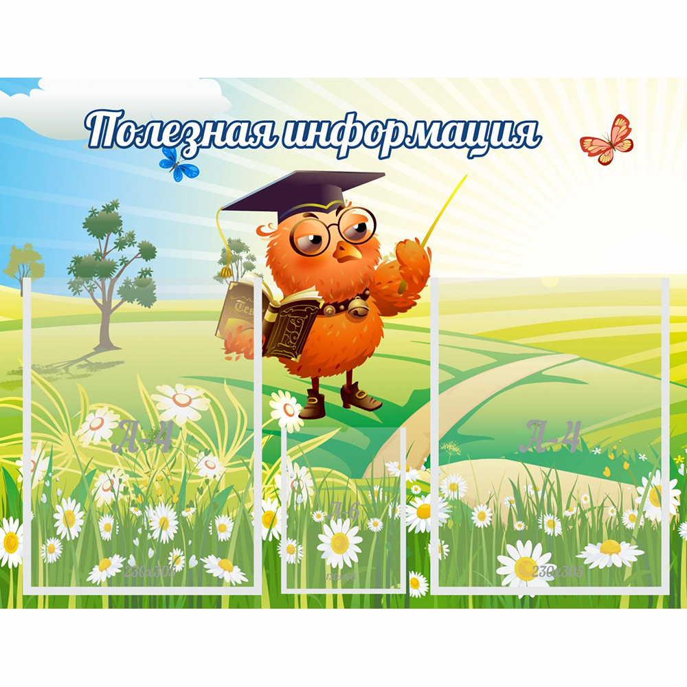 Стенд украшен изображением ученой совы. В карманах можно размещать различные информационные листы, плакаты и важные объявления для детей и их родителей.