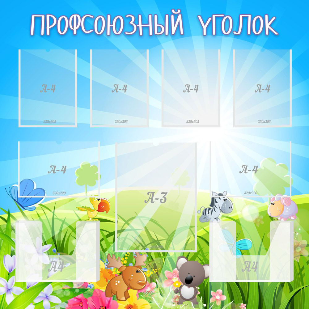 Фон стенда выполнен в светло-голубой гамме, пронизанной солнечными лучами, заголовок размещен верхней строкой. В нижней части картинки видны заросли травы и цветы, среди которых прячутся игрушечные звери. На этом стенде можно поместить информацию о членах профсоюза, актуальных вопросах, находящихся в его компетенции. Удобно будет подать материал про трудовые права коллектива, всевозможные льготы, способы их получения, необходимые документы, графики работы оздоровительных лагерей для детей сотрудников.