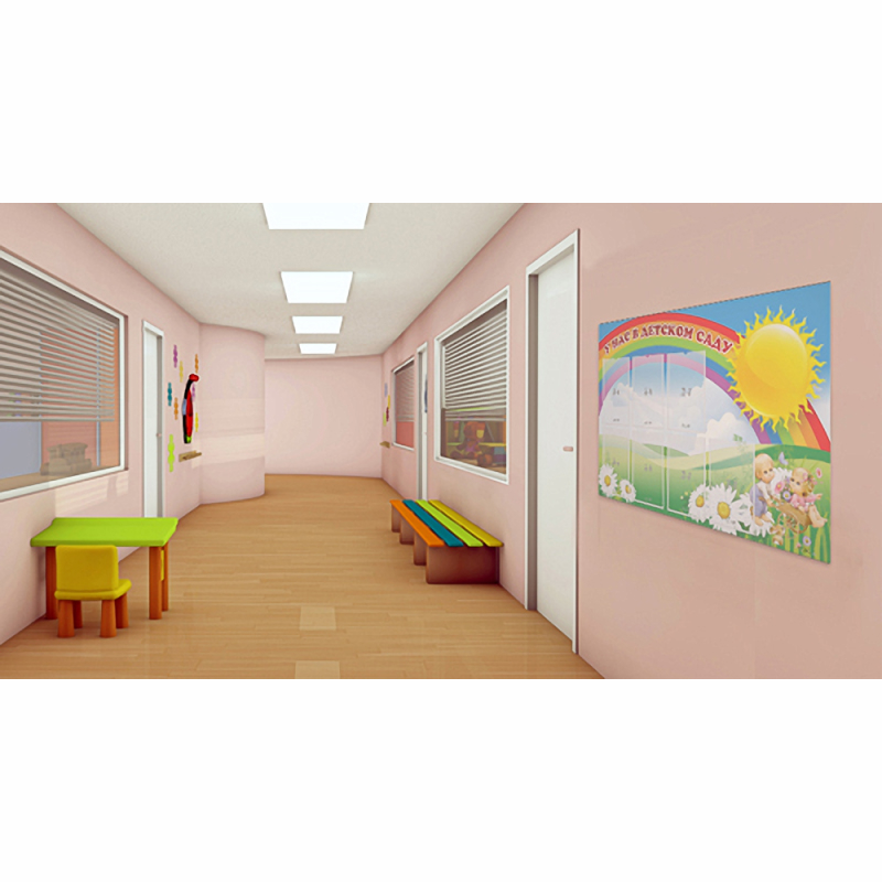 Если вы впервые пришли в детский сад устраивать своего ребёнка, этот стенд для Вас!  На стенде есть специальные разделы «Режим работы детского сада», «Знакомьтесь, наши воспитатели», «Родителям на заметку», «Как приготовить ребенка к детскому саду». В пустых карманах формата А4 могут быть размещены важные объявления, плакаты, фотографии и различные информационные листы о жизни детского сада. Стенд украшен изображением радуги, солнца и цветов.