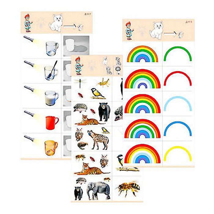 Пособие состоит из 10 полноцветных, напечатанных на картоне и ламинированных пленкой карточек. Является частью игрового набора "Обучающий калейдоскоп для дошкольного образования".