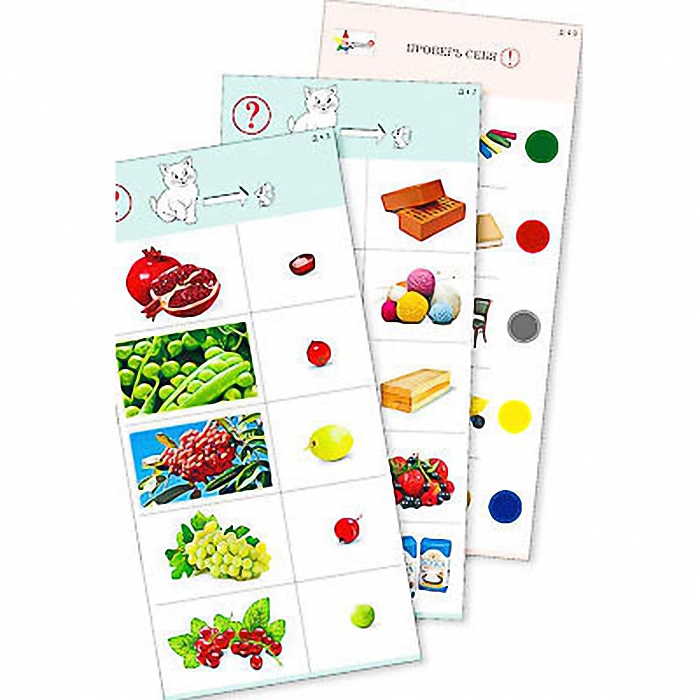 Пособие состоит из 10 полноцветных, напечатанных на картоне и ламинированных пленкой карточек. Является частью игрового набора "Обучающий калейдоскоп для дошкольного образования".