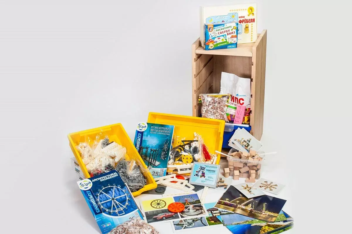 - Комплект № 1 «Архитектура». В комплект входят элементы для конструирования из различных материалов: дерево, пластик, бумага, карточки-схемы, набор инструментов «Юный архитектор», видео-контент, журнал проекта.