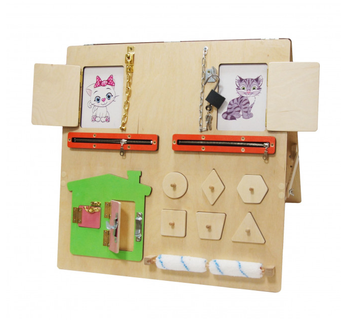 Бизиборд изготовлен из натуральной древесины - это насыщенный развивающий игровой опыт для малышей от 3-х лет. Он оснащен дверцами с защелками, меховыми валиками, сортером с фигурками на штырьках и одежными застежками на молнии. Бизиборд №2 развивает моторику и помогает детям развить фингермоторику и координацию движений. С ним игра становится не только увлекательной, но и познавательной.