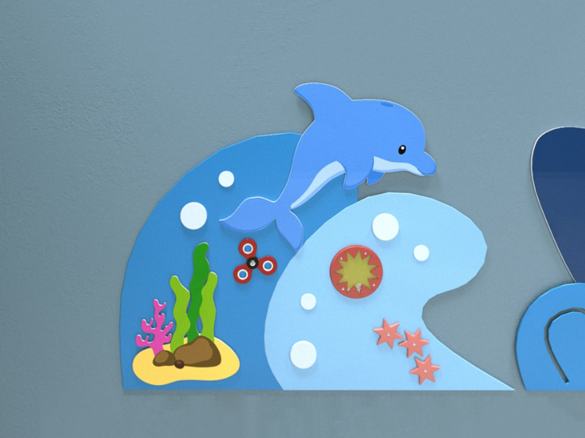 Бизиборд – дидактическое приспособление с игровым уклоном для детей от 3 лет. Может быть как объёмным (куб, домик), так и более компактным - в виде плоской настенной панели, которая замечательно экономит игровое пространство, не уменьшая при этом его ценности. Бизиборд в виде дельфина - одна из таких моделей. Она прекрасно подойдёт для оснащения детских уголков в различных заведениях (кафе, магазинах, банках), размещения в группах детских садиков, подойдёт и для использования дома.