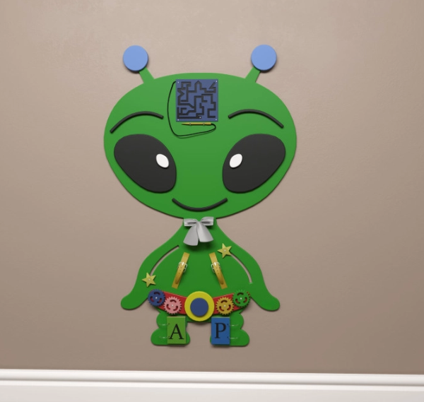 Интересная необычная доска в виде пришельца выполнена из натуральных, а главное безопасных материалов, что позволяет пользоваться бизибордом в домашних условиях, детских садах, а также коммерческих учреждениях, радуя детей на постоянной основе. Разнообразие элементов позволяет придумать огромное количество игр с ребенком как наедине, так и в большой компании.