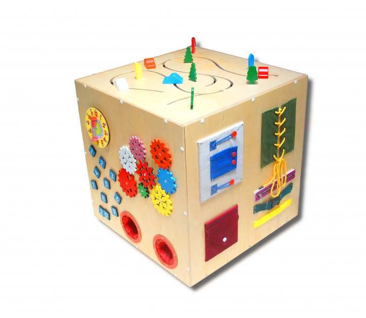 Бизикуб - это развивающее оборудование, заменяющее 5 отдельных бизибордов и предназначенное для детей от 3-х лет. Изготовленный из натуральной древесины, он компактный и мобильный, позволяя ребенку развиваться и играть в любом месте. Шестеренки, шнуровка, часы, крутящиеся элементы, цифры, тактильные ячейки, руль, счеты, одежные застежки и тактильные лабиринты - всем этим оснащен наш Бизикуб №1, и все это помогает развивать моторику и логическое мышление ребенка.