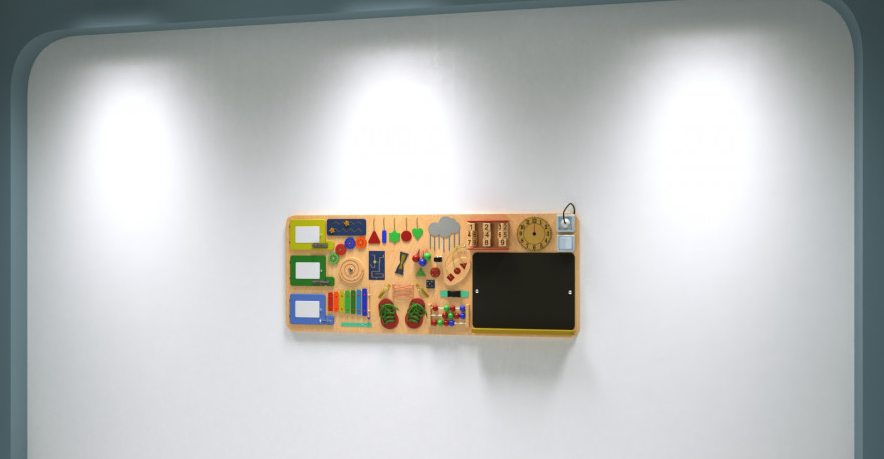 Бизипанель – это удачное сочетание настенной игровой панели и бизиборда. Она больше, обычный компактный бизиборд и более функциональна, чем стандартная настенная игровая панель, так как оснащена большим количеством игровых приспособлений. Основание представленной модели выполнено в спокойном нейтральном бежевом цвете, а игровые элементы выделяются яркими акцентами.