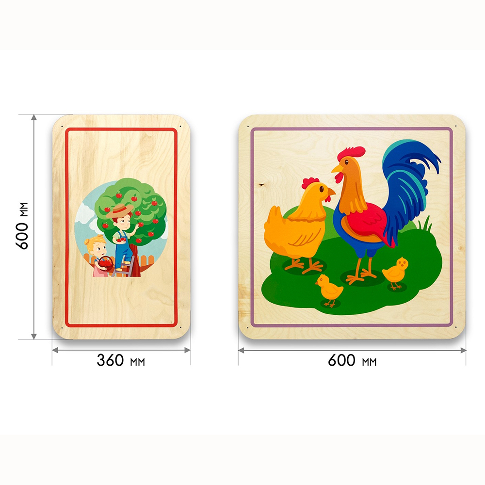 Дополнительные модули бывают однотонные и с тематическими иллюстрациями, подходящими под тематику дидактических панелей. Разнообразие размеров способствует декорированию стен различной конфигурации и масштабов. Параметры варьируются от совсем маленьких модулей 300х300 мм до крупных размеров 600х600 мм.