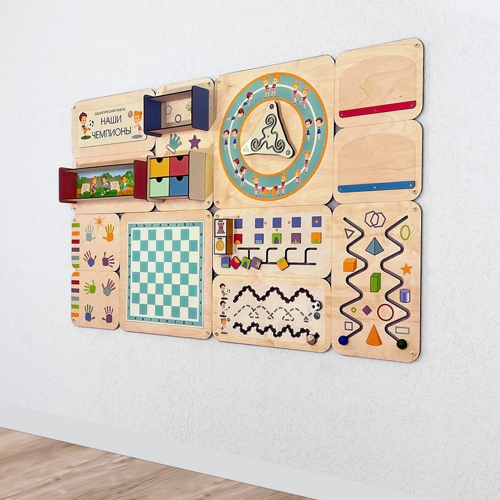 Дидактические панели отлично дополняю наборы цветных и иллюстрированных стеновых панелей, которые позволят оформить всё помещение в едином стиле.