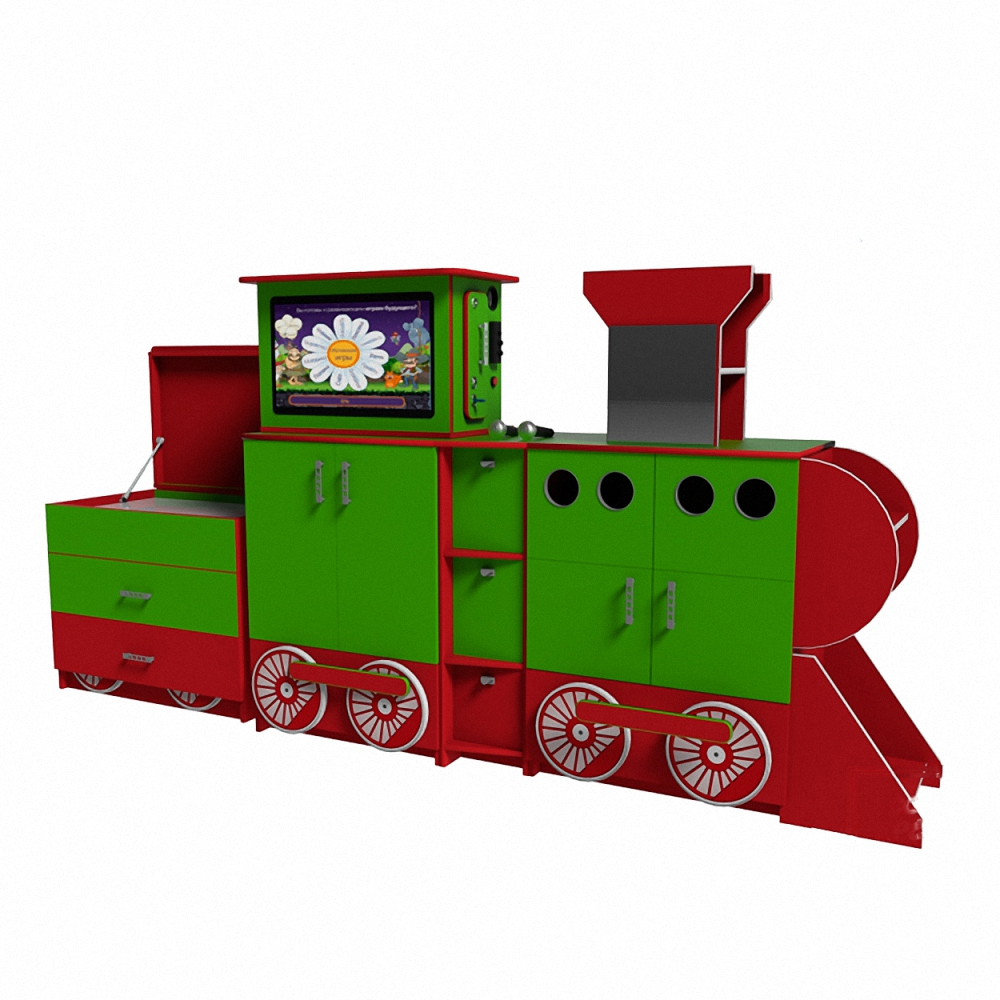 Оборудование представлено в необычном формате: в виде паровозика с выдвижными ящиками, шкафчиками, интерактивным планшетом, зеркалами для отработки мимики, беспроводной радио системой на 2 микрофона и песочным столом. Для взаимодействия с мультимедийным комплексом имеется клавиатура и мышь. Для подключения дополнительных источников в наличии кабели HDMI и Usb 2.0.