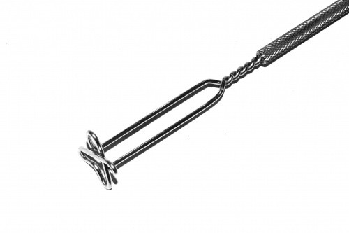Зонд « Крестовина» служит для массажа мышц языка, скул, щек. Используется при массаже средней, прикорневой частей языка, что позволяет воздействовать на мышцы, обеспечивающие подъем языка. Нажимая на язык и отодвигая его назад, мы заставляем сокращаться и работать мышцы указанных областей языка. Крестовиной можно сжимать мышцы языка, удерживая их в сжатом положении. С помощью этого зонды выполняются надавливающие, пружинистые возвратные движения, надавливающие круговые. Зонд используется для постановки звуков Г, К, Х, и шипящих звуков. Степень нажима зависит от состояния мышц: чем ниже тонус, тем интенсивнее нажатие.